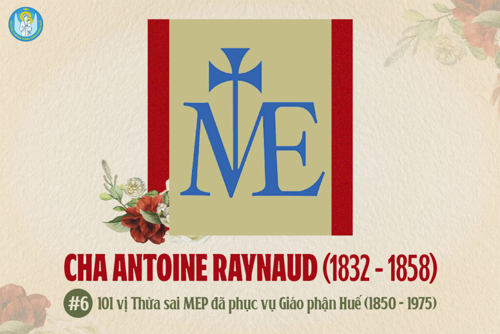 Tiểu sử 101 vị Thừa sai MEP đã phục vụ Giáo phận Huế (1850 – 1975) Số 06. CHA ANTOINE RAYNAUD (1832-1858) Cha Raynaud, Antoine-Marie sinh ngày 20.06.1832 tại làng Auzolles, xã Villedieu (Cantal), thụ phong linh mục...