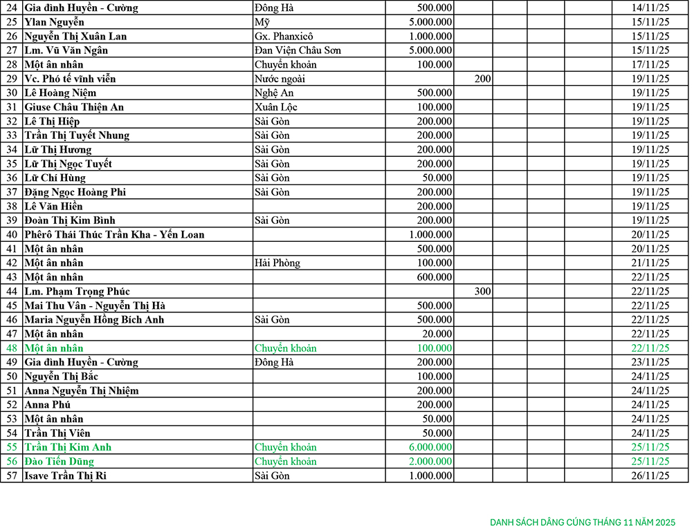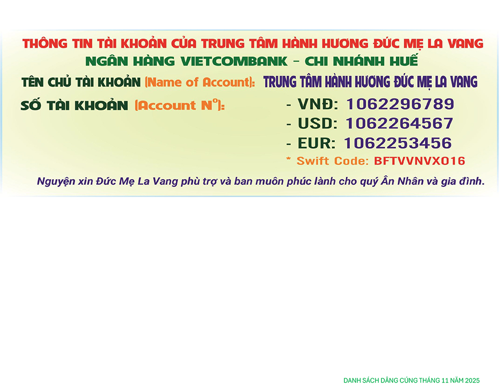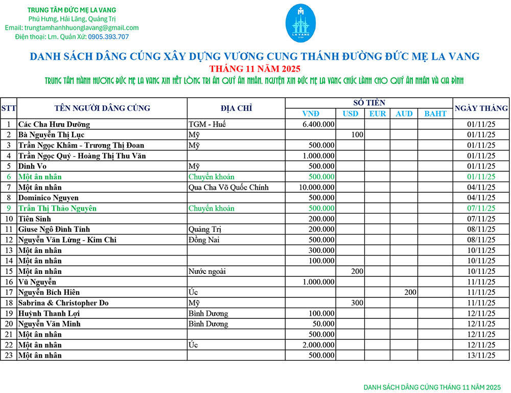 Danh sách ân nhân dâng cúng xây dựng Vương cung Thánh đường Đức Mẹ La Vang – Tháng 11.2025 01/12/2025 => Xin nhấn vào đây để tải bản PDF