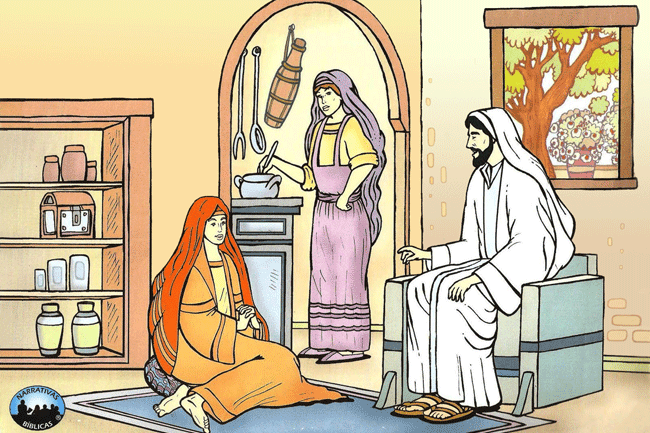 Sự đối chọi giữa hai chị em trước tiên gắn liền với việc Ma-ri-a được trình bày như môn đệ hoàn hảo, ngồi dưới chân Chúa để đón nhận giáo huấn của Người. Tư thế của cô là tư thế cổ điển (x. Lc 8,35; Cv 22,3[1]). Nhưng nên nhớ truyền thống rab-bi Do-thái không bao giờ nhận phụ nữ làm môn đệ và càng không để phụ nữ ngồi dưới chân ông thầy. Chúa Giê-su quả là khác lạ. Thái độ của bà chủ nhà thì ngược lại, đúng quy ước, phù hợp với vai trò của các phụ nữ-môn đệ như thấy ở Lc 8,3. Nhất là bà muốn cô em chớ hành động khác mình ; thậm chí bà còn xác tín rằng Chúa chỉ có thể đồng ý với trật tự các giá trị của bà thôi.