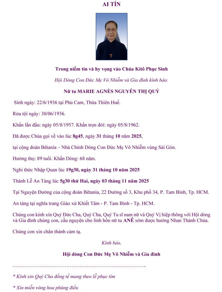 - Ai tín của Dòng Con Đức Mẹ Vô Nhiễm Huế: Nữ tu Marie Vitalis Magarita Nguyễn Thị Thuyết (13/02/2026)