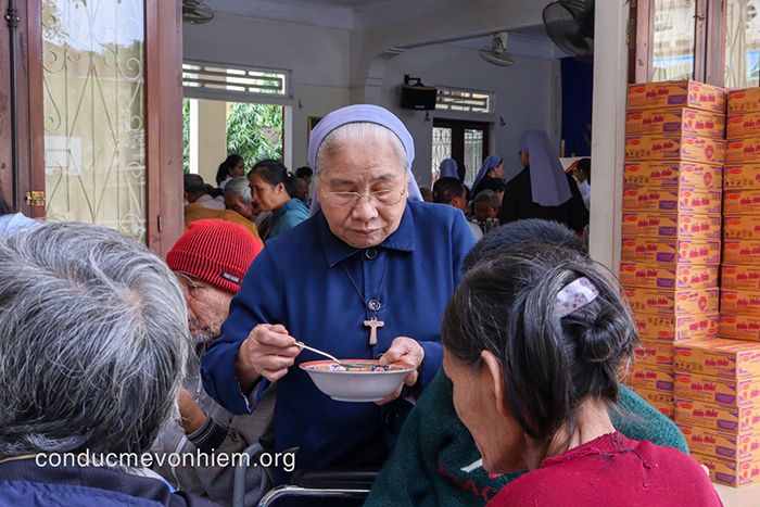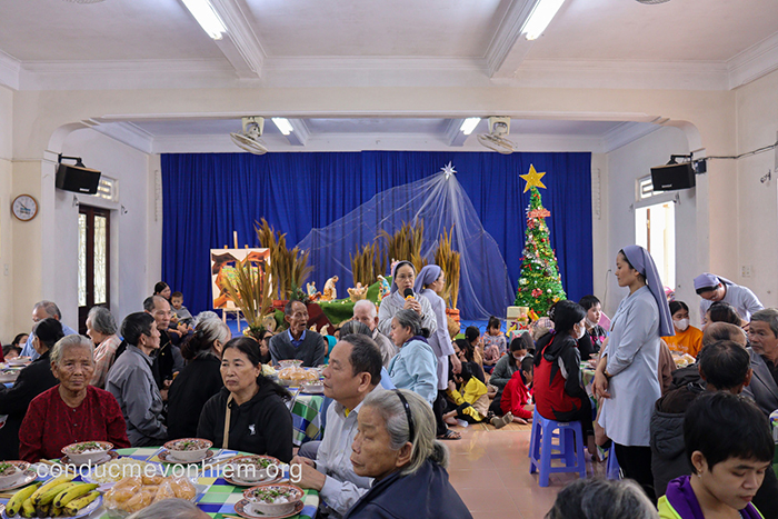 Mỗi độ Giáng Sinh về, Nhà Mẹ Hội Dòng lại trở thành mái nhà chung ấm áp, nơi những người nghèo, người già neo đơn, anh chị em khuyết tật, các em bại não, bại liệt – đặc biệt là anh chị em khiếm thị thuộc Hương Vinh và vùng phụ cận thành phố Huế – được mời đến để cùng sẻ chia niềm vui mừng Chúa Giáng Sinh. Giữa những con người bé nhỏ và đơn sơ ấy, Chúa thật sự đang ở giữa họ – không trong ánh đèn rực rỡ hay những nghi thức long trọng, nhưng trong từng ánh mắt, từng nụ cười và từng cử chỉ yêu thương được trao ban.