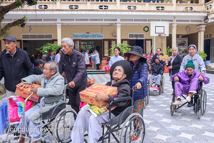 Vào ngày 19.12.2025, ngay từ 09g00 sáng, chị em tại Nhà Mẹ, từ em Thanh tuyển đến các chị Cao niên đã hiện diện, sẵn sàng đón tiếp 200 anh chị em. Những bàn tay ân cần nắm lấy bàn tay, từng bước chậm rãi dìu dắt anh chị em khiếm thị, đẩy từng người trên chiếc xe lăn vào hội trường, đến với những bàn ăn đã được chuẩn bị chu đáo. Dù bị khiếm khuyết hay bệnh tật, nhưng nơi đây lại tràn ngập ánh sáng của sự cảm thông, của tình người và của niềm vui được đón nhận.