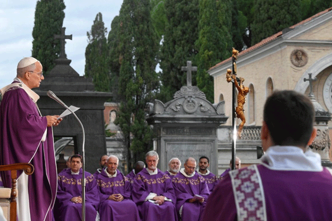 Anh chị em thân mến, dù bóng dáng người thân yêu không còn đồng hành cùng chúng ta trên nẻo đường trần thế, nỗi đau chia lìa vẫn hằn sâu nơi con tim. Nhưng giữa những vết thương ấy, chúng ta vẫn tin tưởng vào “niềm hy vọng không làm thất vọng” (Rm 5,5). Chúng ta nhìn lên Đức Kitô Phục Sinh; nghĩ về những người thân yêu như đang được bao phủ trong ánh sáng của Người; chúng ta hãy để cho lời hứa về sự sống đời đời của Chúa thấm vào lòng chúng ta. Chính Người sẽ vĩnh viễn tiêu diệt sự chết. Chính Người đã mở một lối đi vượt qua sự chết – nghĩa là làm nên cuộc Vượt Qua của Người – để khi chúng ta kết hợp với Người, chúng ta cũng có thể bước qua và sống mãi trong sự sống ấy.