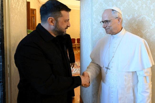 Ngày 09/07/2025 ĐTC Lêô XIV đã tiếp tổng thống Ucraina Volodymyr Zelensky tại dinh thự mùa hè Barberini ở Castel Gandolfo. Hai bên đã thảo luận về sự cấp thiết của “những tiến trình hòa bình công bằng và lâu dài”, trong đó đối thoại là con đường được ưu tiên để chấm dứt sự thù địch.