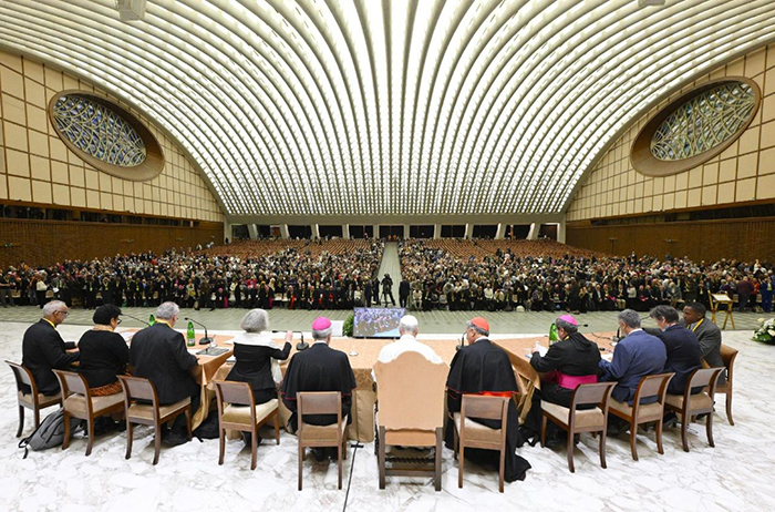 Trước sự hiện diện của Đức Thánh Cha, đại biểu các châu lục lần lượt trình bày hoa trái hành trình hiệp hành và được Đức Thánh Cha đáp trả: