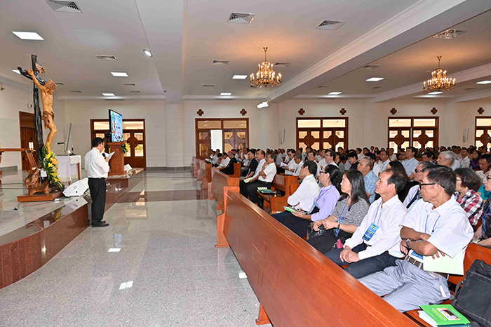 Chương trình được tiếp nối với phần trình bày tổng quan về tập sách “Hành trình dự tòng cho đời sống hôn nhân” của Thánh Bộ Giáo dân, Gia đình và Sự sống”, do Cha Agostino Nguyễn Văn Dụ – Trưởng ban Nghiên huấn – chia sẻ.