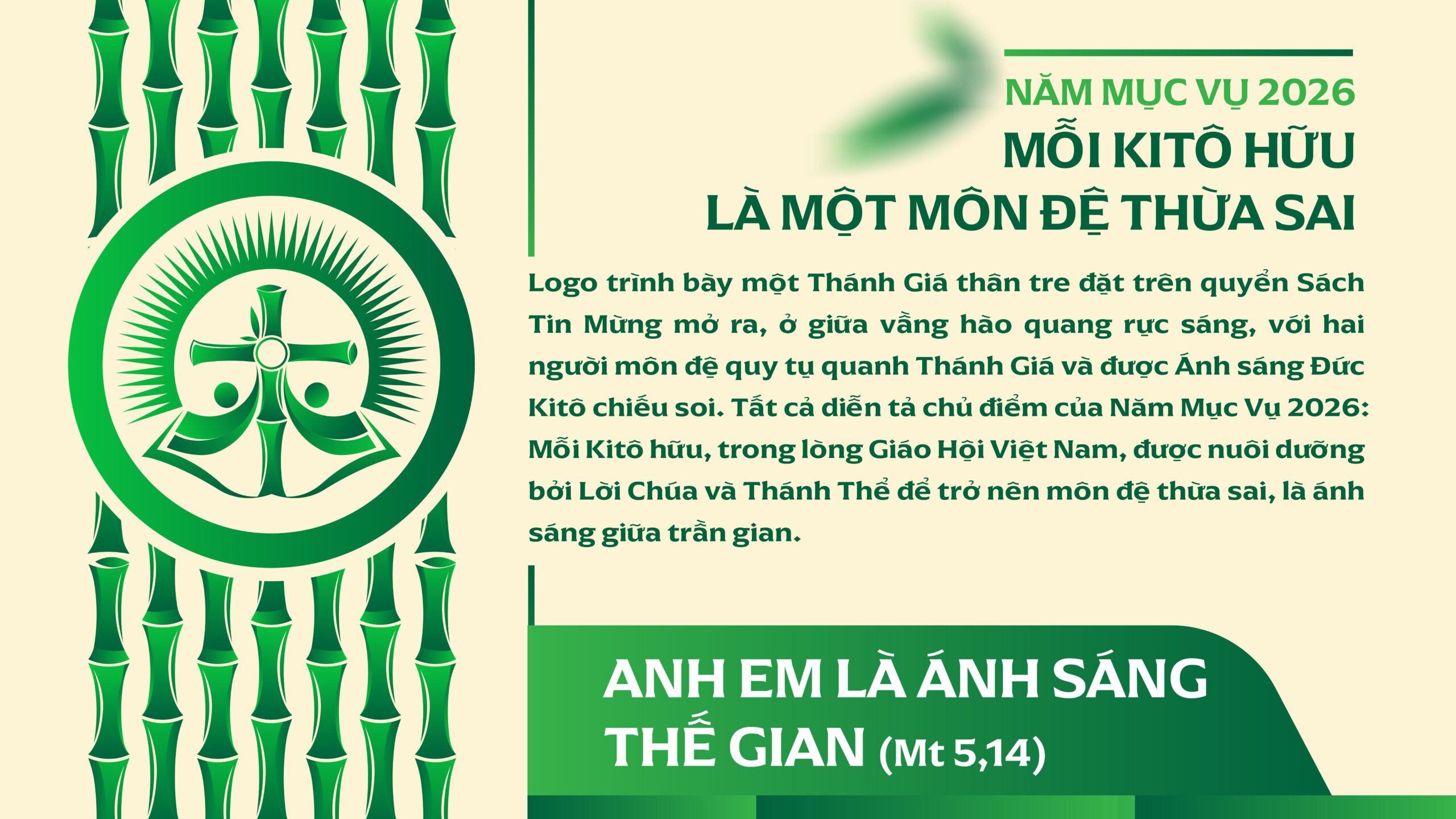 WHĐ (08.12.2025) – Văn phòng Thư ký Hội đồng Giám mục Việt Nam giới thiệu logo chính thức cho năm Mục vụ 2026 của Giáo hội Việt Nam với chủ đề: Mỗi Kitô hữu là một môn đệ thừa sai: “Anh em là ánh sáng thế gian” (Mt 5,14).