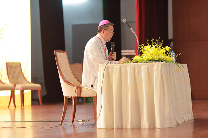 Trong bầu khí trang nghiêm, Đức Cha Giuse Nguyễn Đức Cường – Giám mục giáo phận Thanh Hoá, vị chủ nhà, đã ngỏ lời chào mừng, bày tỏ niềm hân hoan và hạnh phúc của giáo phận khi được đón tiếp quý mục tử về tham dự khoá thường huấn nơi vùng biển Sầm Sơn hiền hoà, thân thiện.