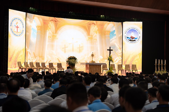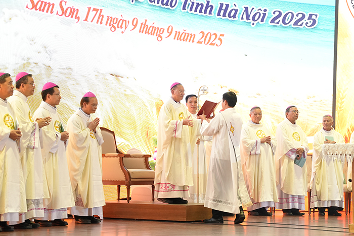 Tiếp đến, Đức Tổng Giám mục Giuse Vũ Văn Thiên – Tổng Giám mục Hà Nội, thay lời cho cả Giáo tỉnh, long trọng công bố khai mạc. Ngài nhấn mạnh: thường huấn là hành trình làm mới lại tâm hồn, canh tân đời sống thiêng liêng, trau dồi kiến thức và bồi đắp tinh thần hiệp hành trong sứ mạng linh mục. Đức Tổng bày tỏ niềm vui lớn lao khi nhìn thấy hình ảnh 1.667 linh mục cùng hiện diện, để cầu nguyện, suy tư và sống tình huynh đệ. Ngài gợi mở ba mục đích chính yếu của kỳ thường huấn năm nay: Chia sẻ tình huynh đệ linh mục và đời sống của Hội Thánh; Cập nhật những định hướng của Giáo hội hoàn vũ cũng như thao thức của Giáo hội Việt Nam. Và dành thời gian lắng đọng tâm hồn qua tĩnh tâm, chầu Thánh Thể, bí tích Hoà giải, đồng thời nghỉ ngơi và gắn kết tình thân nơi miền biển Sầm Sơn xinh đẹp.