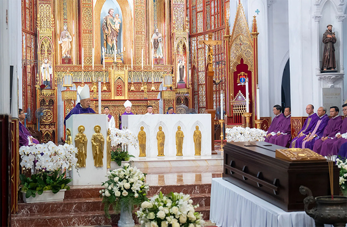 Linh cữu Đức cố Giám mục được trang trọng đặt giữa lòng Nhà thờ Chính Tòa Hà Nội – nơi ngài từng dâng Thánh lễ và tận tụy phục vụ trong khiêm tốn, nay trở thành điểm hẹn cuối cùng để cộng đoàn tiễn biệt vị mục tử trung tín với tâm tình kính mến và tin tưởng vào niềm hy vọng Phục Sinh.