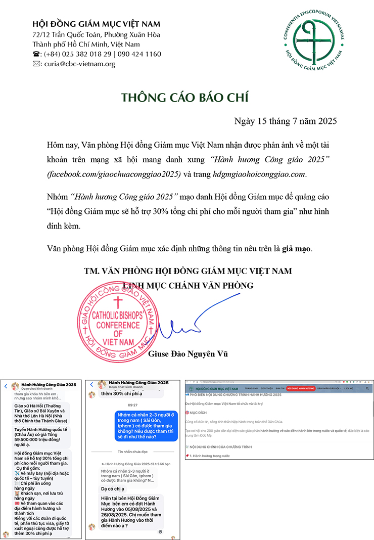 Văn phòng Hội đồng Giám mục Việt Nam: Thông cáo báo chí ngày 15.07.2025 15/07/2025 Nguồn: hdgmvietnam.com