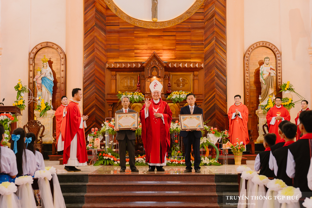 Sau lời nguyện hiệp lễ, Đức TGM Giuse trao phép lành của Đức Thánh Cha cho 2 vị cao niên trong Giáo xứ, đã có đồng hành với Giáo xứ, với các Cha Quản xứ và Phó xứ trong công cuộc dựng xây đời sống Đức tin, đời sống yêu thương hiệp nhất trên xứ truyền giáo núi rừng này.