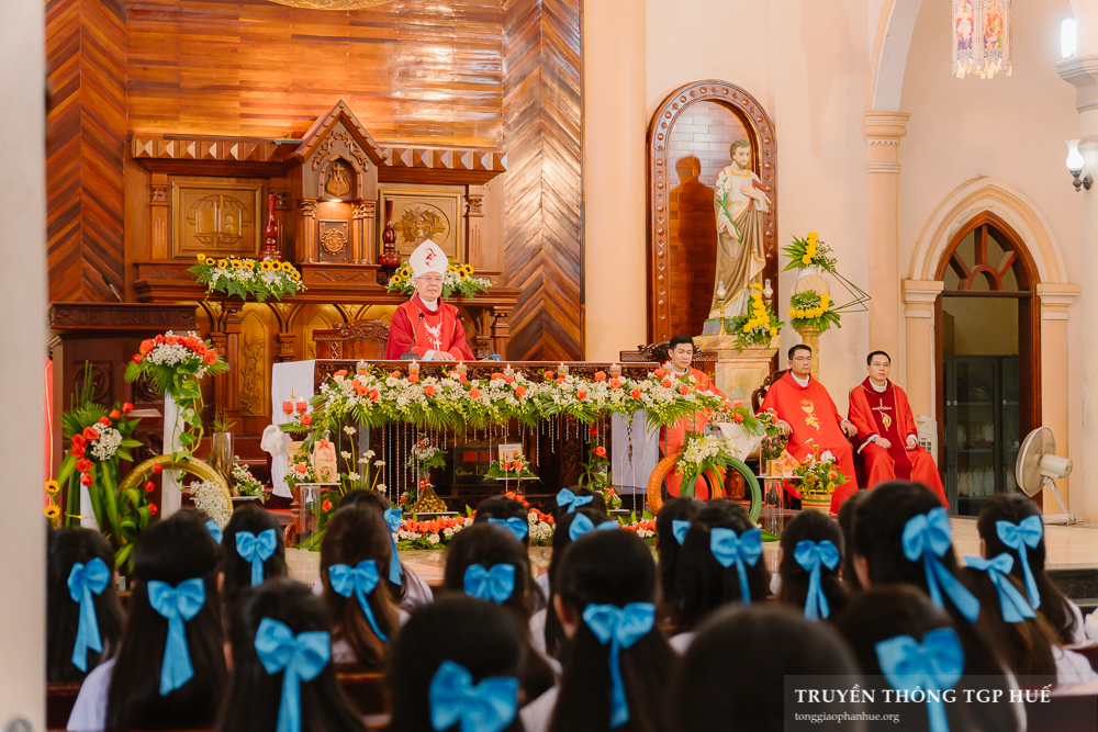 Kế đó là bài giảng lễ của Đức TGM Giuse. Ngài cho biết sau khi được Chúa Giêsu phục sinh trao ban Thánh Thần, các Tông đồ tràn đầy niềm hy vọng, tràn đầy sức mạnh và tràn đầy tình yêu dành cho Thiên Chúa. Các Tông đồ dù đã đồng hành với Chúa suốt 3 năm Người rao giảng, nhưng mãi đến khi đi qua cuộc khổ nạn và phục sinh của Chúa, rồi được Người trao ban Thánh Thần, các ông mới hiểu biết được những mặc khải về Thiên Chúa, về Ơn Cứu độ. Kết quả là các ông lên đường rao giảng những điều các ông tin. Ngày hôm nay với 7 hồng ân Chúa Thánh Thần do Đức Giám mục đặt tay thông ban, không làm cho mỗi thụ nhân trở nên to lớn hay có sức mạnh phi thường, không làm cho các em nói được các ngôn ngữ lạ trong chốc lát. Nhưng Đức TGM Giuse nhấn mạnh, những ơn đó sẽ biến đổi các em nên mạnh về Đức tin, vững về Đức cậy và nồng nàn lòng mến, đồng thời biến các em nói được ngôn ngữ của Tình yêu, trở nên những chiến sĩ của Lòng thương xót Chúa.