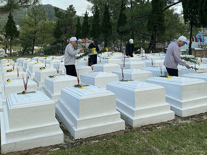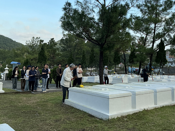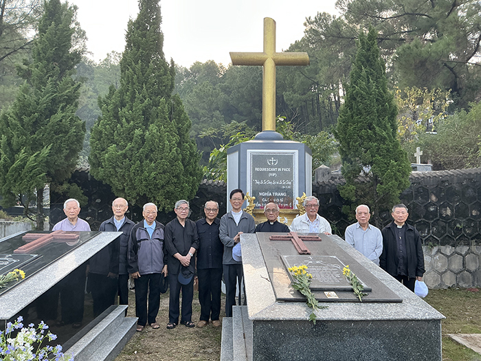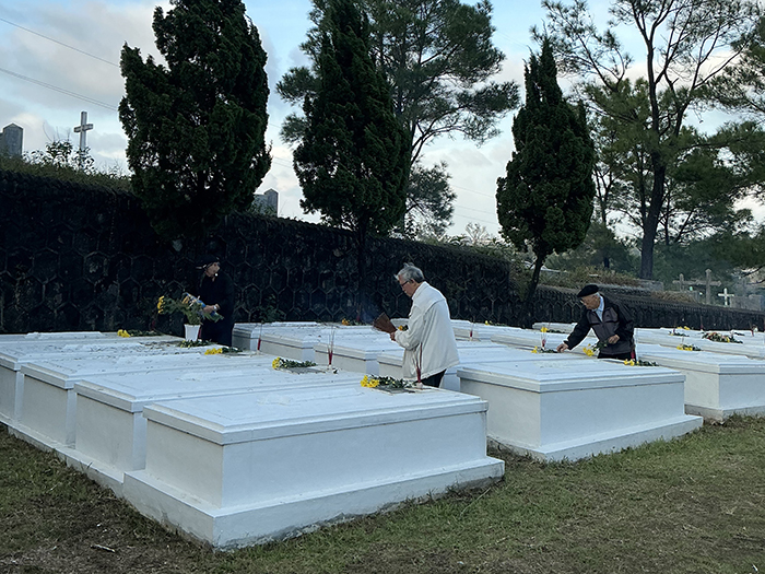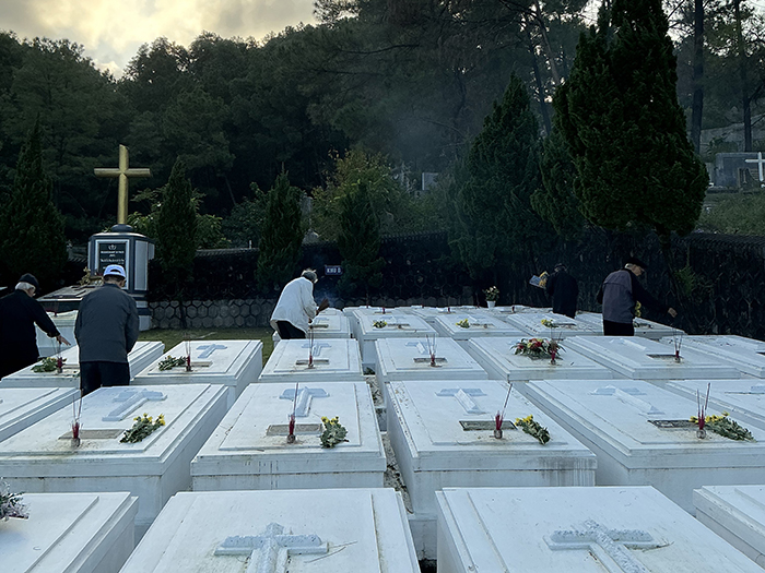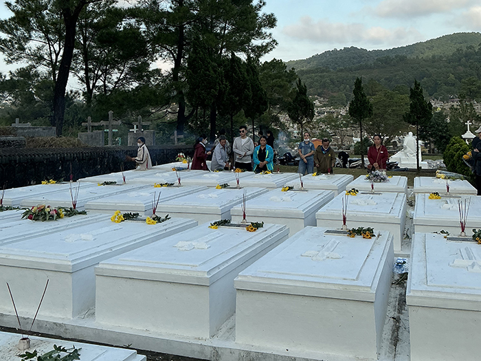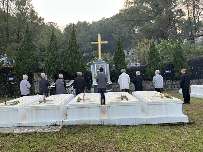 Chiều ngày 08.11.2025, khi nắng vàng còn vương trên cánh cây lá cỏ, các Cha Nhà hưu dưỡng viếng mộ các Cha đàn anh đang an nghỉ đồi Thiên Thai. Tại mỗi ngôi mộ, các Cha đặt 2 cành hoa cúc vàng tươi, tỏa hương nhẹ nhàng và cắm 3 cây hương tỏa khói trắng lên cao. Trong phút chốc, quang cảnh trở nên linh thiêng, toàn thể các Cha nằm xuống ở đó, là của lễ toàn thiêu chiều hôm, bay lên trước Tôn nhan Thiên Chúa. Kinh nguyện và thánh ca như chiếc thuyền đưa tâm hồn các Cha lên gặp gỡ, hàn huyên với anh em thân yêu đã lìa cõi dương thế, nay đang ở trong vòng tay yêu thương trìu mến của Đấng mà quý Cha đã tận tụy phụng sự suốt cuộc sống trần gian.