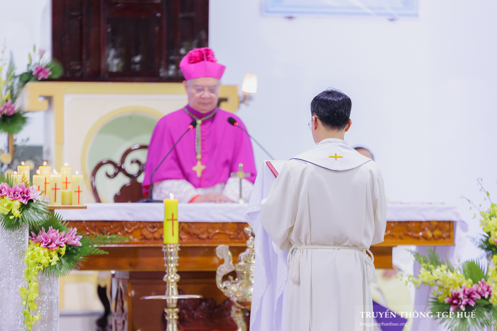 Cha Tân Quản xứ nhận sách Tin Mừng từ Đức TGM và long trọng công bố cho cộng đoàn. Kế đó là phần chia sẻ Lời Chúa của Đức TGM Giuse chủ sự.