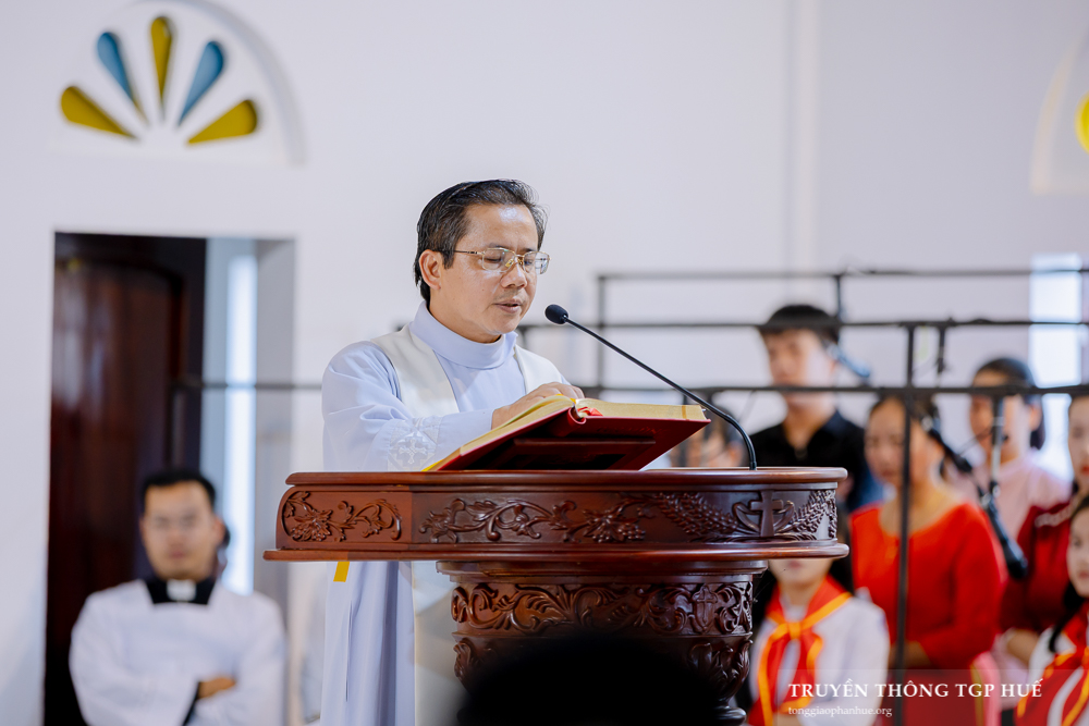 Cha Tân Quản xứ nhận sách Tin Mừng từ Cha Tổng Đại diện Barnaba và long trọng công bố cho cộng đoàn. Kế đó là phần chia sẻ Lời Chúa của Cha Tổng Đại diện Barnaba chủ sự.