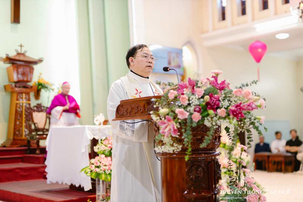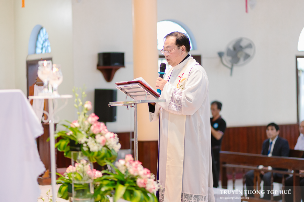 Cha Tân Quản xứ nhận sách Tin Mừng từ Đức TGM Giuse và long trọng công bố cho cộng đoàn. Kế đó là phần chia sẻ Lời Chúa của Đức TGM Giuse chủ sự.