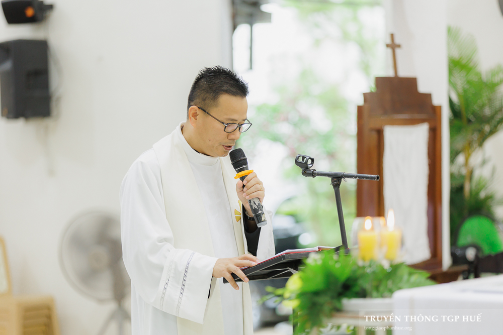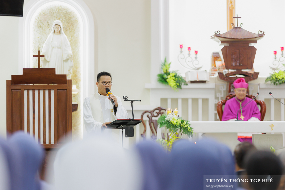 Cha Tân Quản xứ nhận sách Tin Mừng từ Đức TGM và long trọng công bố cho cộng đoàn. Kế đó là phần chia sẻ Lời Chúa của Đức TGM Giuse chủ sự.