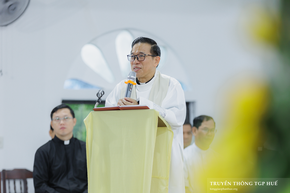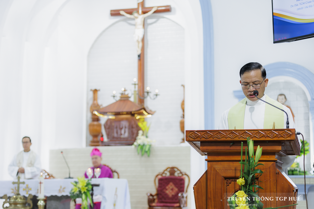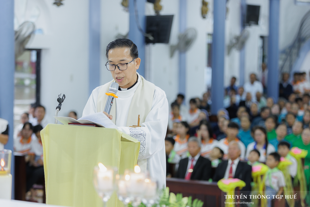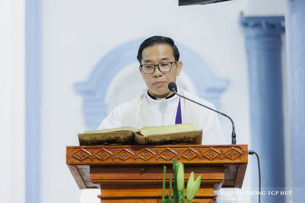 Cha Tân Quản xứ nhận sách Tin Mừng từ Đức TGM và long trọng công bố cho cộng đoàn. Kế đó là phần chia sẻ Lời Chúa của Đức TGM Giuse chủ sự.