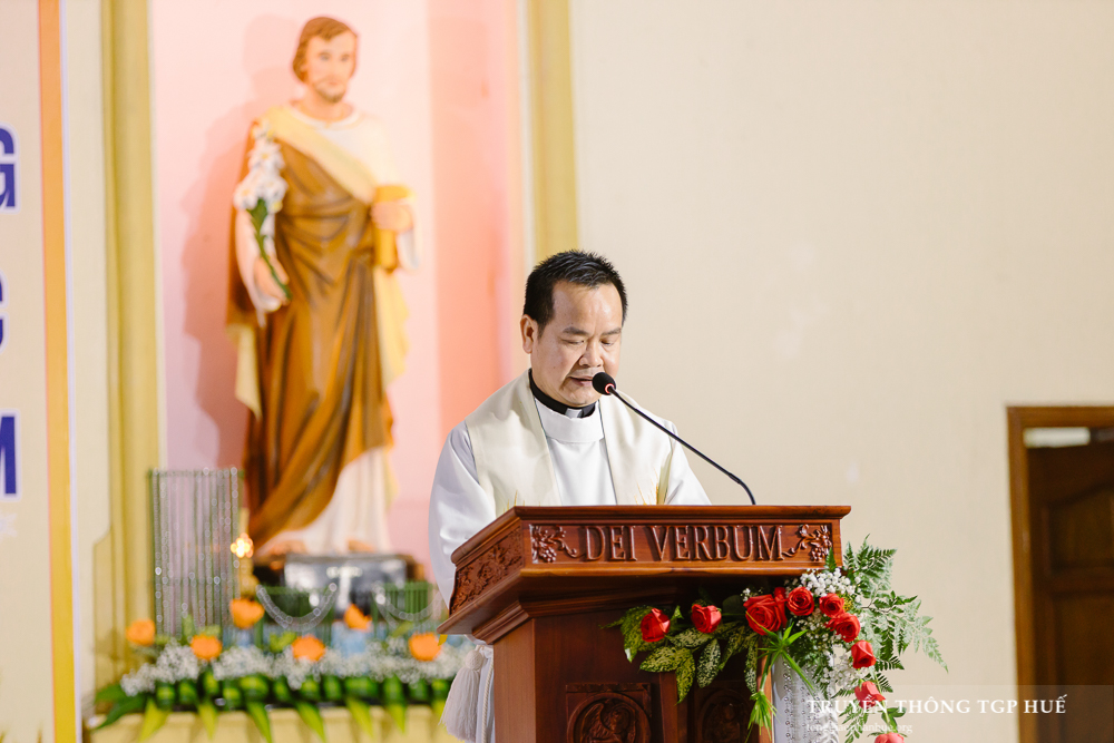 Cha Tân Quản xứ nhận sách Tin Mừng từ Cha Tổng Đại diện và long trọng công bố cho cộng đoàn. Kế đó là phần chia sẻ Lời Chúa của Cha Tổng Đại diện Barnaba chủ sự.