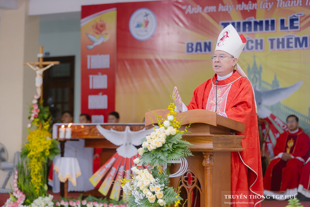 Với các em Thêm sức, Đức TGM Giuse cũng mời gọi các em hãy tham dự tích cực vào đời sống cộng đoàn Giáo xứ, ở lại trong Chúa, bên nhau, cùng nhau sống Đức tin và tin tưởng vào Thiên Chúa. Ngày hôm nay, Chúa cũng mời gọi mỗi em vào đời làm chứng cho Chúa nơi môi trường làng xóm, trường học, xa hơn là công sở và cũng sẵn sàng lắng nghe tiếng Chúa để sống đời ơn gọi Linh mục và Tu sĩ.