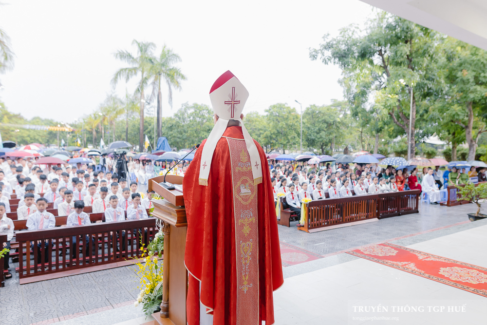 Kế đó là bài giảng lễ của Đức TGM Giuse. Ngài cho rằng hành trình Đức tin của các em sắp lãnh Bí tích hôm nay cũng tiệm tiến từ thuở bé đến trưởng thành, như hành trình của các Tông đồ từ ngày theo Chúa, chứng kiến cái chết khổ nhục của Người, đón nhận Chúa Thánh Thần và rồi mạnh dạn dấn thân loan báo Tin Mừng. Khi Thầy mình được mai táng trong mồ, các Tông đồ đã ở lại bên nhau, nguyện cầu trong hy vọng, và quả thật, Đấng là nguồn hy vọng đã sống lại, trao ban Thánh Thần và sai đi vào đời làm chứng.