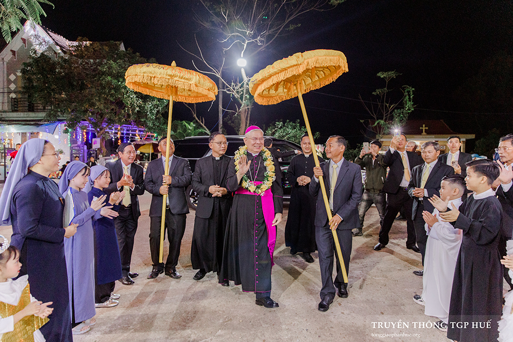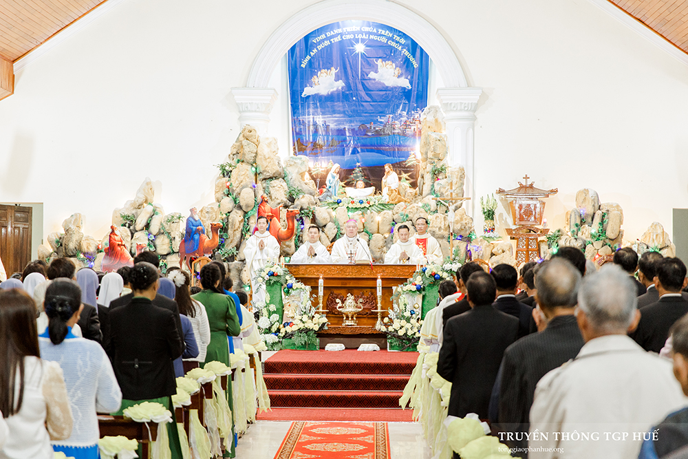 Giờ diễn nguyện kết thúc, cộng đoàn lắng đọng trong ít phút. 20g30, Thánh lễ đêm mừng Chúa Giáng Sinh được Đức TGM Giuse long trọng cử hành bên trong Nhà thờ Giáo xứ. Mở đầu Thánh lễ, Đức TGM Giuse mời gọi cộng đoàn hân hoan tạ ơn Thiên Chúa vì đã ban tặng cho nhân loại chính Con Một của Ngài để ở với và cứu độ con người.