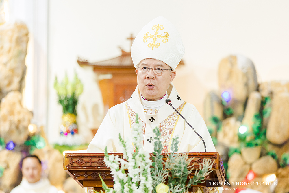 Trong bài giảng lễ, Đức TGM Giuse nhấn mạnh đến biến cố Nhập thể của Chúa Giêsu nơi hang lừa máng cỏ là một cuộc tái tạo mới cho nhân loại. Từ ngày tổ tông loài người bất tuân lệnh Thiên Chúa, tội lỗi đã đi vào thế giới, len lỏi trong mọi ngõ ngách của sinh hoạt trần thế. Chúa Giêsu Hài Đồng chính là lời hứa cứu độ mà Thiên Chúa ban cho nhân loại, Người đến để cứu thế giới khỏi ách nô lệ tội lỗi, Người là Hoàng tử bình an. Chúa Giêsu đã đến, không phải trong cuồng phong sấm chớp hay với đội quân hùng mạnh, nhưng trong dáng vẻ của một hài nhi bọc tả, nằm trong máng cỏ, mang thân phận của một người nghèo.