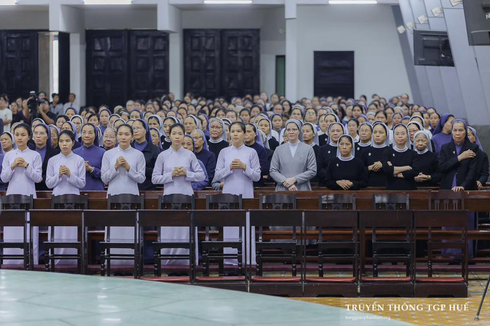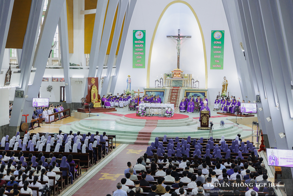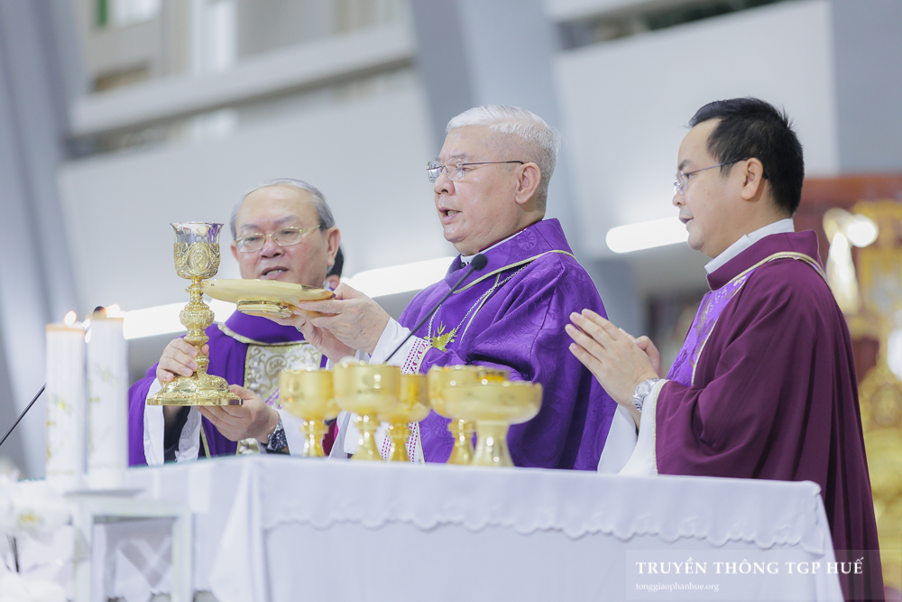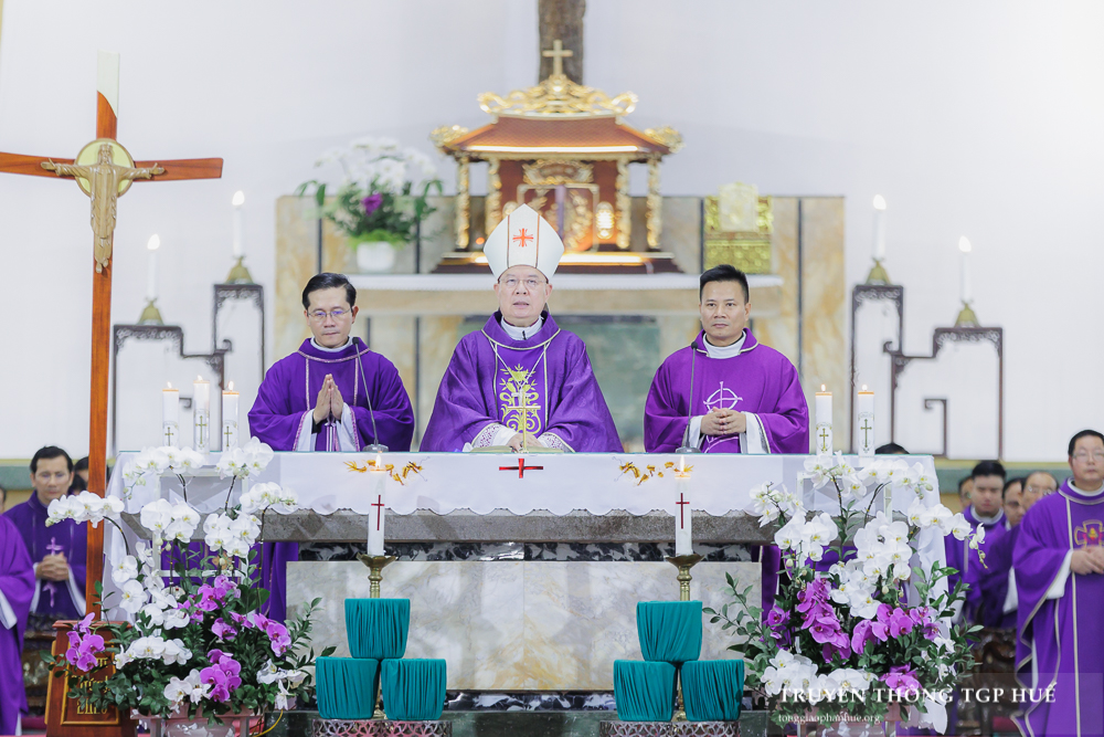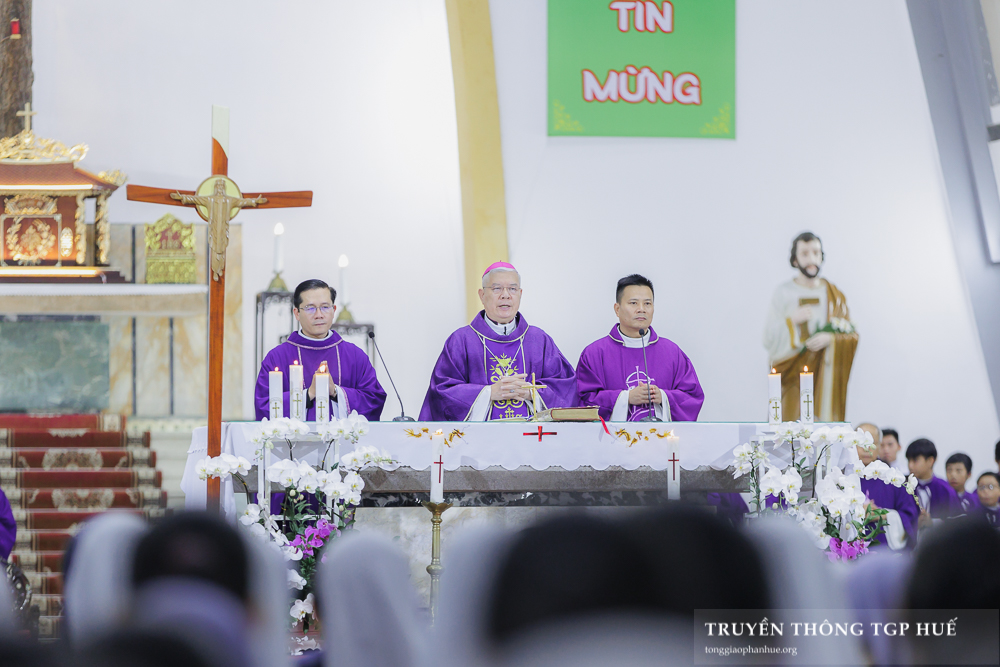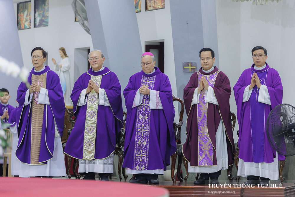 Đồng tế với Đức TGM Giuse trong Thánh lễ có Đức Cha Phanxicô Xaviê Lê Văn Hồng – Nguyên TGM TGP Huế, Cha Barnaba Trần Đình Phục – Tổng Đại diện, Cha Đaminh Phan Hưng – Đại diện Giám mục Đặc trách các Hội đoàn, quý Đức Ông cùng quý Cha trong TGP. Sốt sắng hiệp dâng Thánh lễ có đông đảo Tu sĩ nam nữ, Chủng sinh và anh chị em giáo dân.