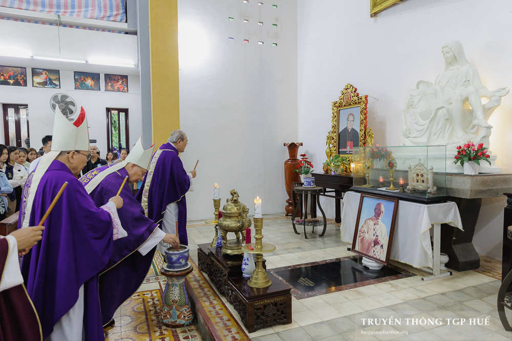Sau khi ban phép lành cuối lễ, quý Đức TGM, Cha Tổng Đại diện, Cha Đại diện Giám mục đến dâng hương cầu nguyện tại bàn thờ phụ cánh phải Nhà thờ, nơi đây đặt tượng Thánh Tử đạo Phaolô Tống Viết Bường, di ảnh Đấng Đáng kính Đức cố Hồng y Phanxicô Xaviê Nguyễn Văn Thuận và phần mộ Đức cố TGM Philipphê Nguyễn Kim Điền.