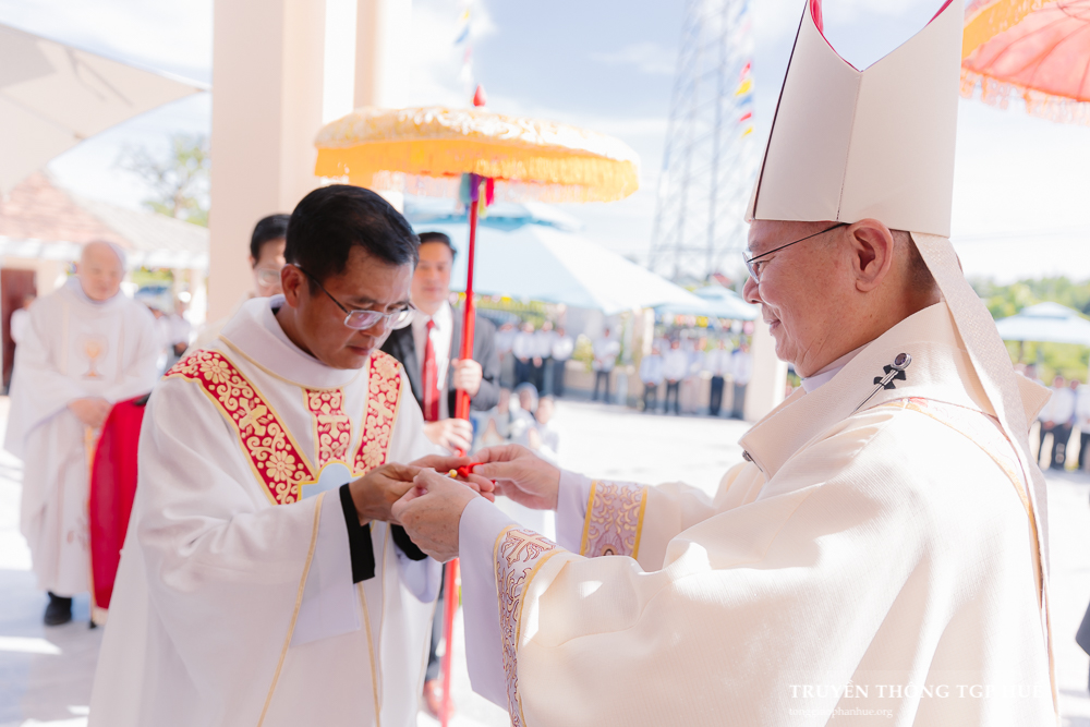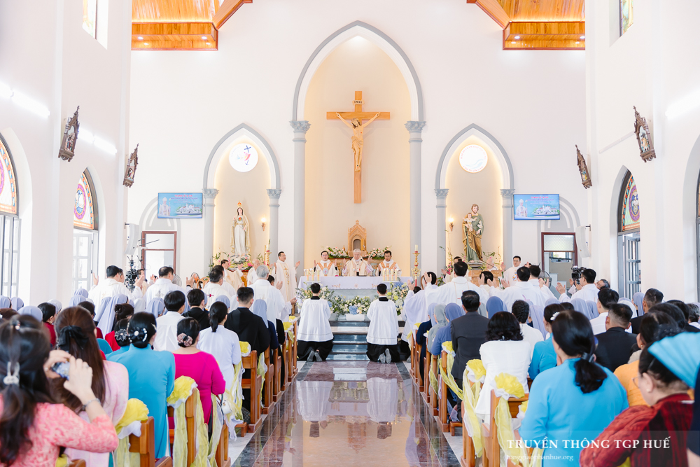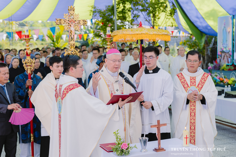 “Anh chị em thân mến! Chúng ta vui mừng tề tựu tại đây để dâng Nhà thờ mới này cho Thiên Chúa. Vậy chúng ta hãy khẩn khoản nài xin Người khấn ban ơn Người đến ở với chúng ta, và dùng quyền năng Người làm phép nước này để rảy trên chúng ta, làm dấu chỉ thống hối và nhớ lại Bí tích Rửa tội, cũng như để thanh tẩy các tường Nhà thờ mới này. Nhưng nhất là chúng ta phải lưu tâm điều này: là chính chúng ta được Đức tin và Đức mến kết hợp nên một, chúng ta là hiện thân của Hội Thánh sống động ở giữa trần gian, để làm dấu chỉ và chứng nhân của tình yêu mà Thiên Chúa yêu thương hết mọi người.” – Đó là lời hiệu triệu của Đức Cha Giuse Đặng Đức Ngân – Tổng Giám mục (TGM) Tổng Giáo phận (TGP) Huế khi bắt đầu nghi thức Làm phép Nhà thờ mới của Giáo họ Đập (thuộc Giáo xứ Nước Ngọt).