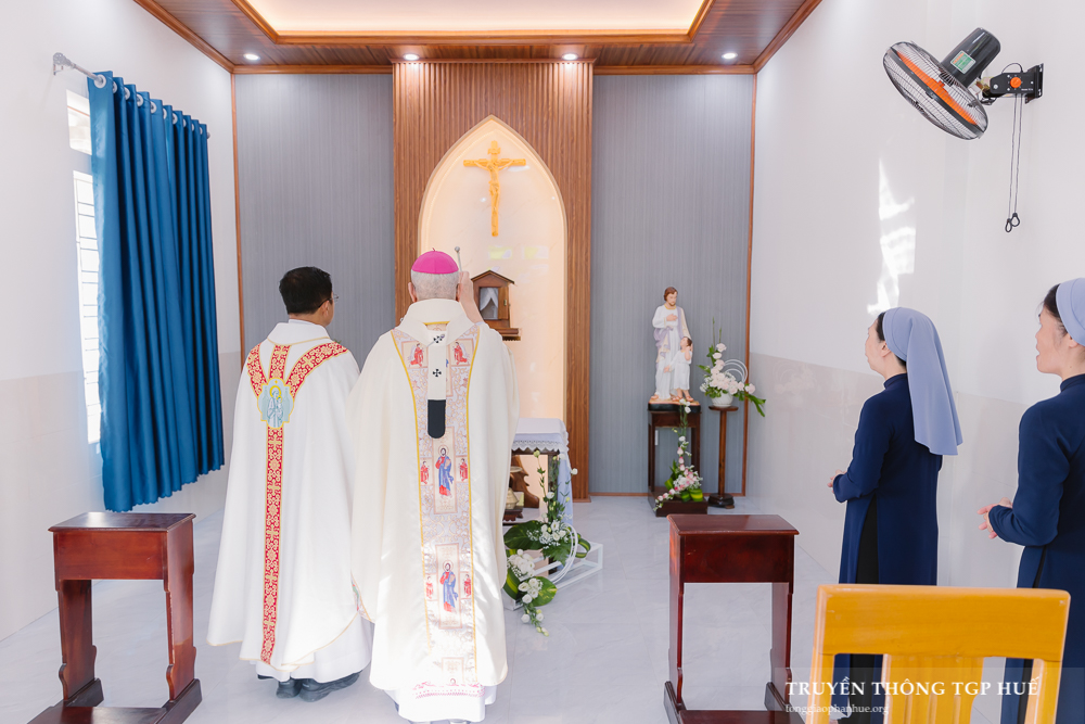 Trước hết, Đức TGM Giuse làm phép cơ sở mới của cộng đoàn quý Nữ tu Dòng Con Đức Mẹ Vô Nhiễm tại Giáo họ Đập. Trên mảnh đất này, quý Nữ tu đã đồng hành cùng giáo dân Giáo họ qua bao truân chuyên của thời cuộc, đón tiếp giáo dân đến cử hành phụng vụ trong nhà nguyện của mình khi Nhà thờ bị chiến tranh bình địa, và nay hiến đất để xây dựng Nhà thờ mới.
