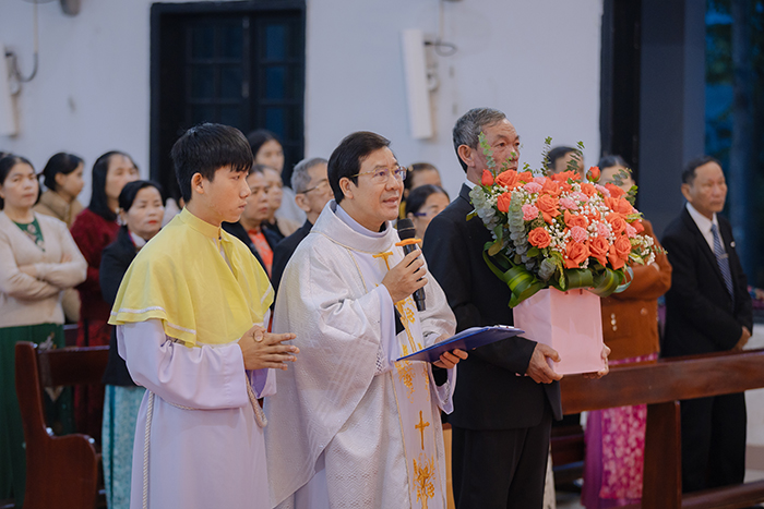 Trước khi bắt đầu Thánh lễ, Cha Quản xứ Anrê Lê Minh Phú thay mặt cộng đoàn bày tỏ tâm tình chào mừng, giới thiệu và tri ân đến Đức TGM Giuse. Đồng thời, Cha Quản xứ Anrê cũng trình bày vài nét sơ lược về lịch sử và hoàn cảnh khó khăn của Giáo xứ.
