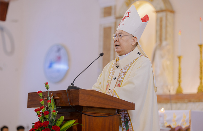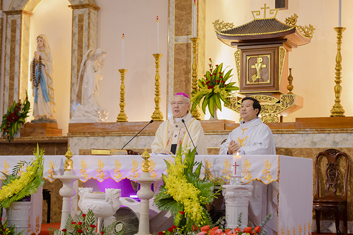 Mở đầu Thánh lễ, Đức TGM Giuse nói lên ý nghĩa của lễ Chúa Giêsu Kitô – Vua vũ trụ mà Giáo Hội cử hành và mời gọi cộng đoàn dọn lòng sốt sắng tham dự Thánh Lễ. Đồng thời, ngài cũng ân cần khích lệ mọi người giúp nhau vượt qua khó khăn do hậu quả lũ lụt và hướng lòng về anh chị em miền Trung – Tây Nguyên đang chịu thiệt hại nặng nề, nhất là Phú Yên trong những ngày mưa lụt vừa qua.