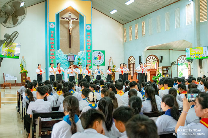 Vào lúc 07g45 ngày 10.07.2025, dưới sự hướng dẫn của quý Thầy Đại Chủng viện cùng các anh chị Huynh trưởng và Giáo lý viên trong Hạt, các em được tập trung và cùng nhau sinh hoạt khởi động. Tiếng vỗ tay rộn ràng, những trò chơi vui tươi, các ca khúc sinh hoạt đầy sôi động – tất cả như khơi dậy nơi tâm hồn các em sự hứng khởi, niềm vui sống đạo, và sự gắn bó thân thương giữa các Giáo xứ bạn bè.