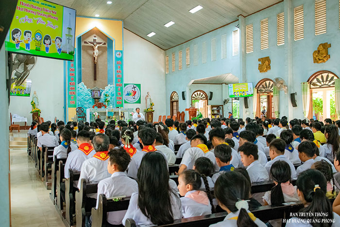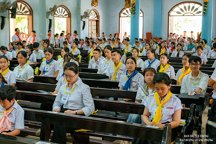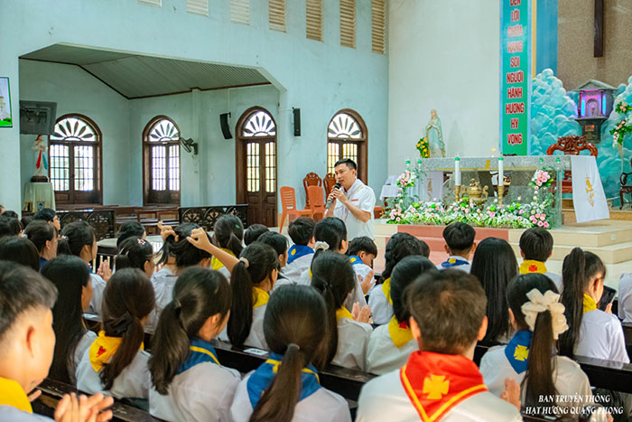 Sau giờ khai mạc, Cha Phanxicô Xaviê Hồ Văn Uyển – Quản xứ Nhất Đông – Quyền Hạt Trưởng Hương Quảng Phong, ban huấn từ ngắn gọn mà sâu sắc, gợi cho các em về ý nghĩa của Năm Thánh, giúp các em thêm sốt mến để lãnh nhận ân sủng trong chuyến hành hương lần này. Đặc biệt, ngài nhắn nhủ các em hãy tỏ ra thân thiện và hoà đồng với những người bạn khác xứ để sau này trở thành những chứng nhân của tình yêu Thiên Chúa.