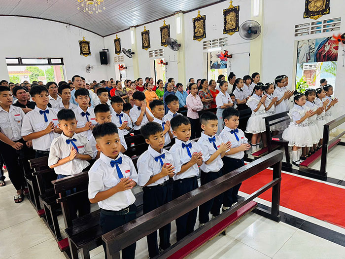 Thánh lễ hôm nay được cử hành cách long trọng, cầu nguyện đặc biệt cho các em được lần đầu rước Chúa vào lòng, đây là một ngày trọng đại, là niềm ước ao và dấu ấn không thể nào quên trong đời sống đức tin của các em, vì chính Chúa Giêsu Thánh Thể ngự thật trong lòng các em và các em được kết hiệp mà nên một với Người.