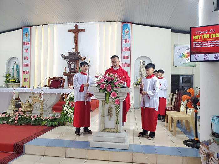 Mở đầu Thánh lễ, Cha Quản xứ đã nói lên ý nghĩa của ngày Lễ Suy tôn Thánh giá mà cộng đoàn đang tham dự, đó là: tôn vinh và tưởng nhớ sự hy sinh mà Chúa Giêsu Kitô đã thực hiện trên thập giá để cứu rỗi nhân loại. Ngài cũng mời gọi mọi thành phần dân Chúa trong Giáo sở cùng hiệp ý cầu nguyện xin Thiên Chúa ban nhiều ơn lành cho các em thiếu nhi trong năm học Giáo lý mới này.