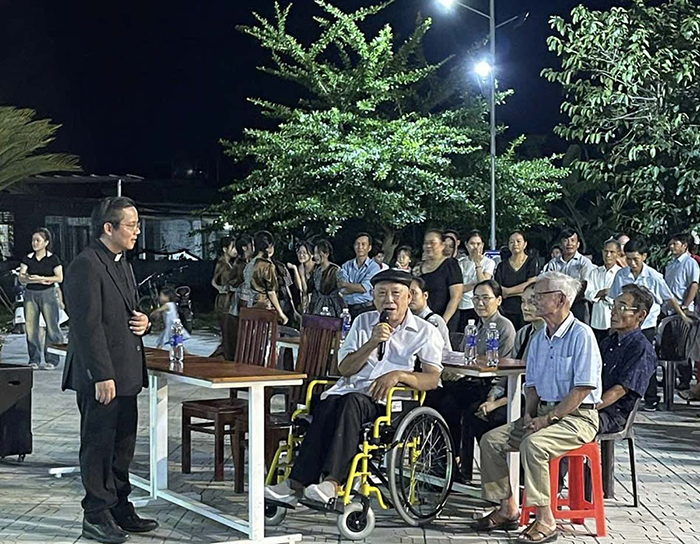 Cha Quản xứ Gioakim đã trao đến các em hiện diện 550 phần quà Trung Thu, và các bạn giới trẻ thì cùng ngồi bên nhau hàn huyên và chia sẻ những bát cháo quê hương thắm đậm nghĩa tình.