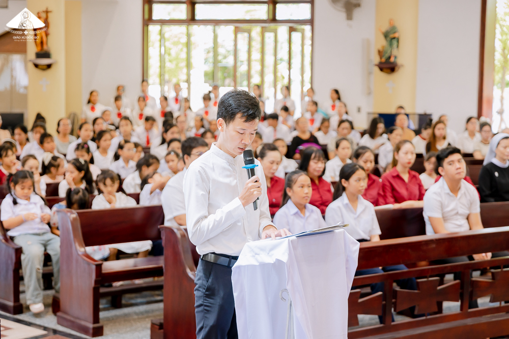 Sau lời nguyện hiệp lễ, anh Phêrô Nguyễn Hồng Lĩnh – Trưởng Ban Giáo lý và Văn hóa của Giáo xứ trình bày sơ lược kế hoạch năm học mới. Trong năm học này, Giáo xứ có 230 em Giáo lý sinh được chia làm 11 lớp: 4 lớp học vào buổi sáng và 7 lớp học vào buổi chiều ngày Chúa Nhật; tham gia giảng dạy có 7 Thầy Đại Chủng viện, 2 Nữ tu cộng đoàn Mai Khôi Đốc Sơ và 10 anh chị Giáo lý viên trong Giáo xứ.
