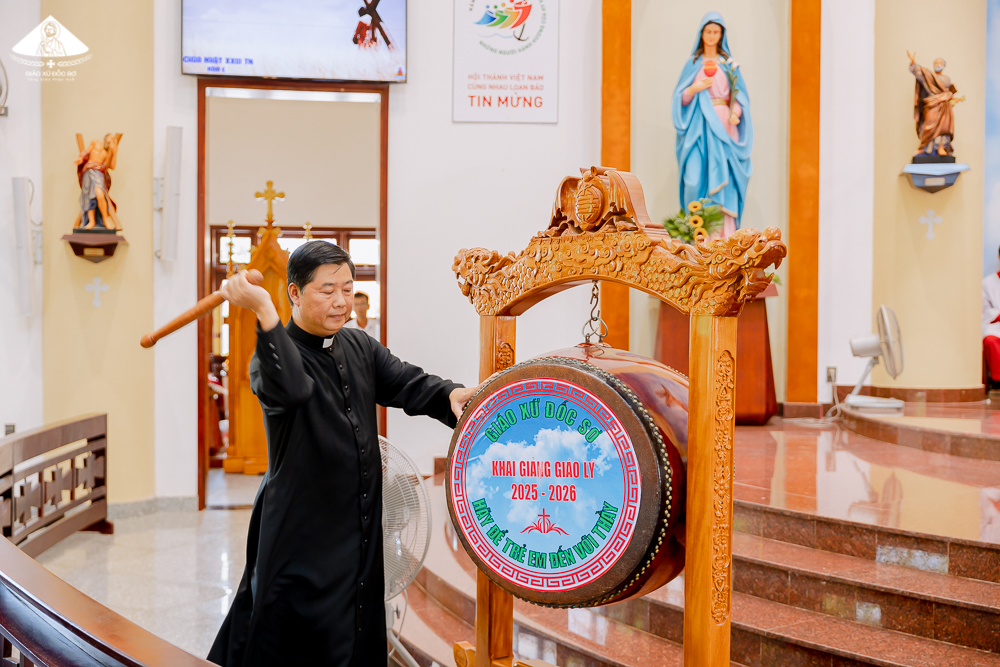Kế đến, Cha Quản xứ Phêrô tuyên bố khai giảng năm học Giáo lý 2025-2026 và gióng một hồi trống rộn rã báo hiệu cho năm học Giáo lý mới được khai mở trong niềm hân hoan của cộng đoàn hiện diện.