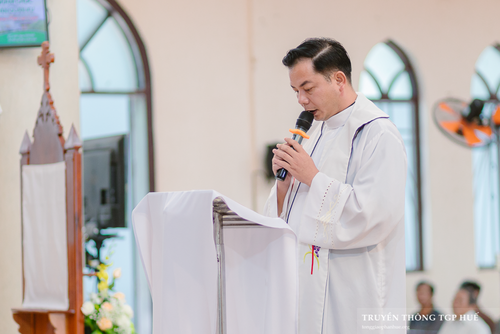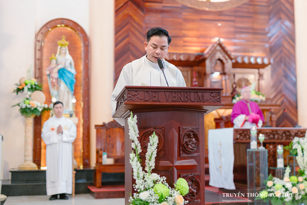 Cha Tân Quản xứ nhận sách Tin Mừng từ Đức TGM và long trọng công bố cho cộng đoàn. Kế đó là phần chia sẻ Lời Chúa của Đức TGM Giuse chủ sự.