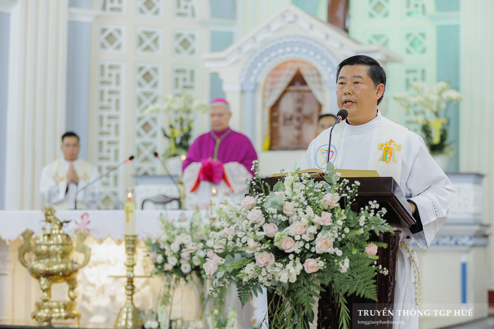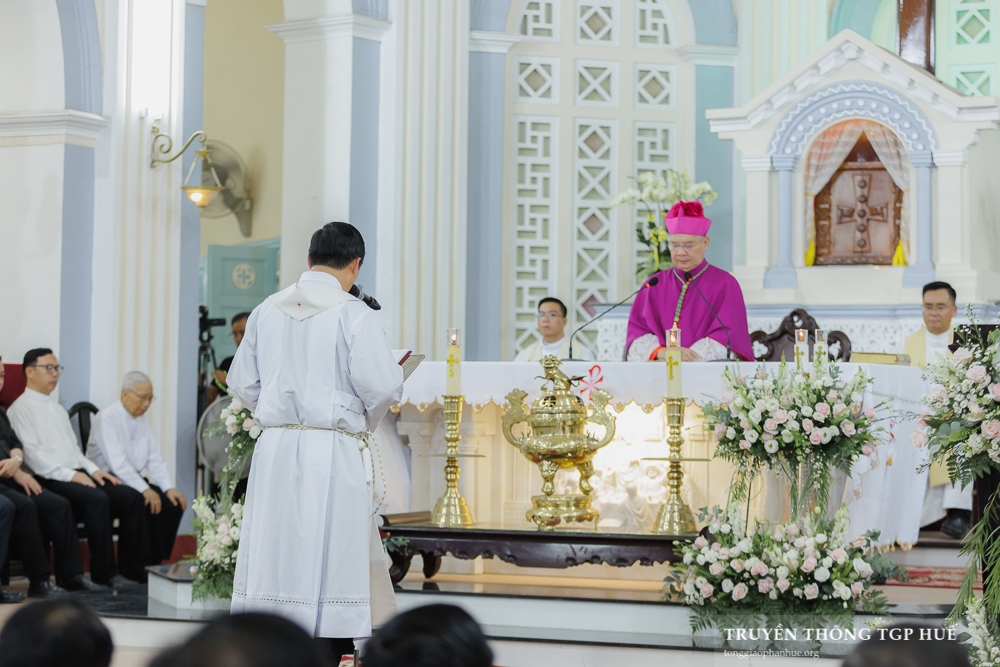 Cha Tân Quản xứ nhận sách Tin Mừng từ Đức TGM Giuse và long trọng công bố cho cộng đoàn. Kế đó là phần chia sẻ Lời Chúa của Đức TGM Giuse chủ sự.