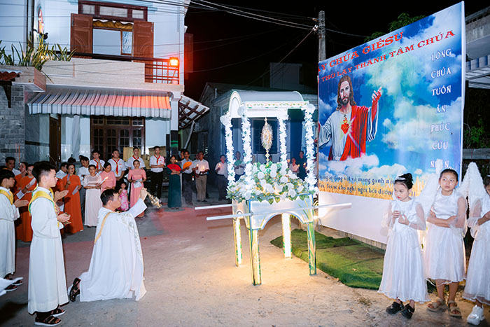Sau nghi thức khai mạc và lời nguyện mở đầu của Cha Chủ sự, cộng đoàn sốt sắng lắng nghe và suy niệm lời Chúa với chủ đề: Bí tích Thánh Thể nguồn hy vọng cho mọi người, cuộc rước kiệu bắt đầu, Thánh Thể Chúa được đặt trong hào quang với bàn kiệu được trang trí trang trọng rước qua các con đường chính trong Giáo xứ và dừng lại tại bốn trạm ở 4 xóm giáo để cộng đoàn cùng chiêm ngắm và tôn thờ Bí Tích Thánh Thể. Tại mỗi trạm dừng, Cha Chủ sự cung kính xông hương Mình Thánh Chúa và vị đại diện của xóm dâng lên Chúa lời cầu nguyện, sau đó cộng đoàn thinh lặng cầu nguyện lắng đọng bên Thánh Thể Chúa. Một bầu khí linh thiêng và trang trọng, một tâm tình sốt mến, một đức tin mạnh mẽ vào Chúa Giêsu Thánh Thể được diễn tả thật cảm động bao trùm trên khắp khắp Giáo xứ và thể hiện trên từng người tham dự.