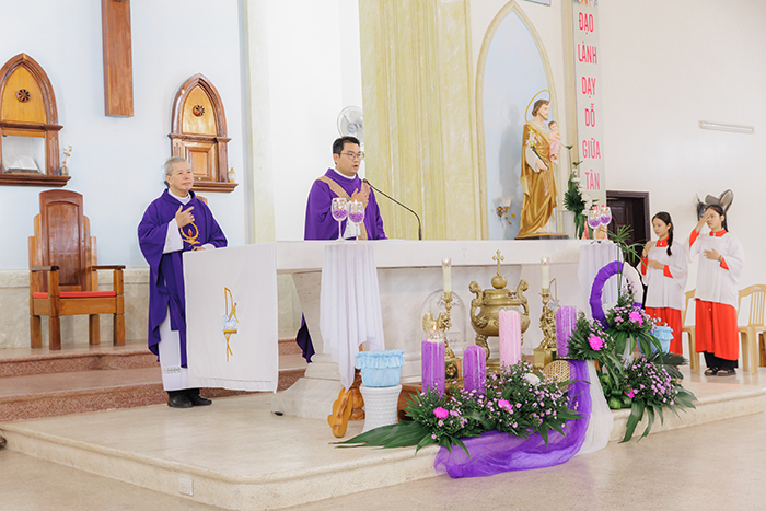 Ngay sau giờ tĩnh tâm là Thánh lễ Chúa Nhật I Mùa Vọng. Thánh lễ do Cha Giuse Trần Văn Long – Quản xứ Giáo xứ Tân Lương chủ tế, Cha Giuse Lê Công Đức đồng tế. Hiệp dâng Thánh lễ có quý Nữ tu và đông đảo mọi thành phần cộng đoàn Giáo xứ.