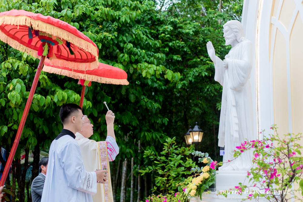 Trước khi đi vào Thánh lễ, Đức TGM Giuse long trọng làm phép đài Lòng Chúa Thương xót toạ lạc trong khuôn viên Nhà thờ Giáo xứ.
