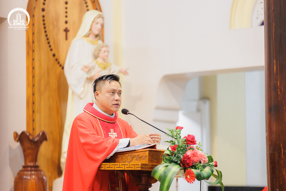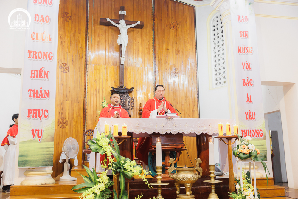 Trong bài giảng lễ, Cha Phó xứ Gioan Baotixita khơi gợi lòng yêu mến Thiên Chúa cách nồng cháy và tinh thần can đảm dám đánh đổi mạng sống vì lý tưởng Đức tin của Các Thánh Tử Đạo Việt Nam. Ngài cũng nhấn mạnh đến gương của Cha Quản xứ tiên khởi Giuse Tống Văn Vĩnh cùng 43 giáo dân Nước Ngọt đã tuyên xưng niềm tin đến hơi thở cuối cùng trước sự tàn sát của quân Văn Thân vào năm 1883.