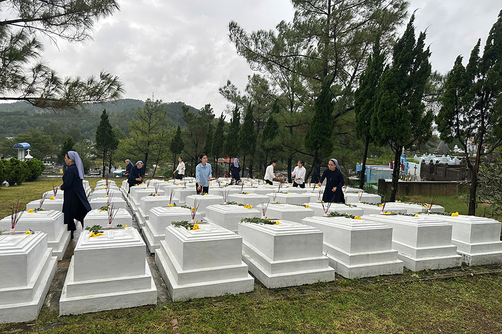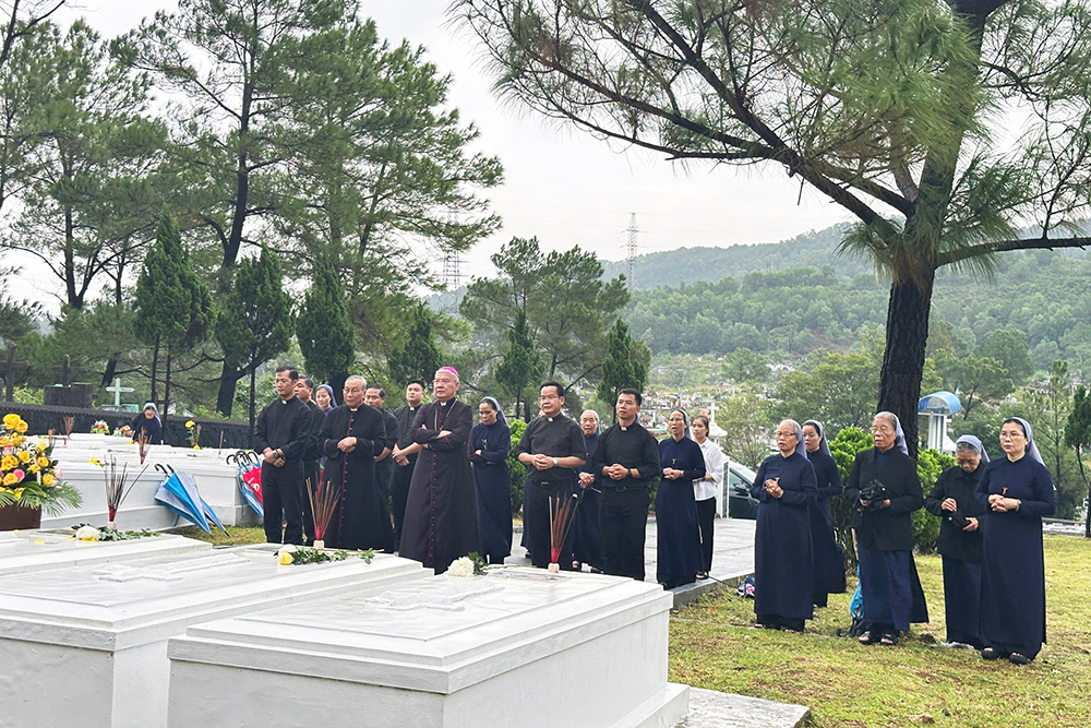 Lúc 16g30, chiều Chúa Nhật 02.11.2025, sau khi cử hành Thánh lễ Cầu cho các tín hữu đã qua đời tại Nhà thờ Chính tòa Phủ Cam, đại diện một số thành phần trong Tổng Giáo phận (TGP) Huế đã đến kính viếng quý bậc Chủ chăn của TGP đang an nghỉ tại đồi Thiên Thai.