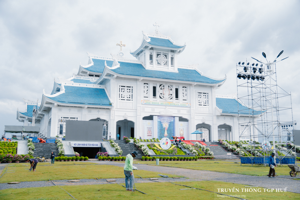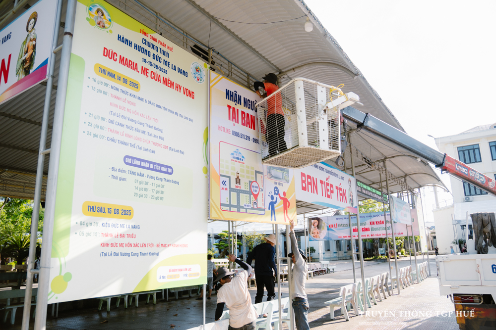 Ngày 12.08.2025, thời tiết tại La Vang diễn biến thất thường, buổi chiều trời mưa nhẹ. Tuy có phần trở ngại, nhưng mọi công tác chuẩn bị cho kỳ Hành hương Thường niên La Vang đã dần hoàn thiện. Khu vực Linh đài và Lễ đài đã được trang trí hoa tươi, phông nền cùng hệ thống chiếu sáng.