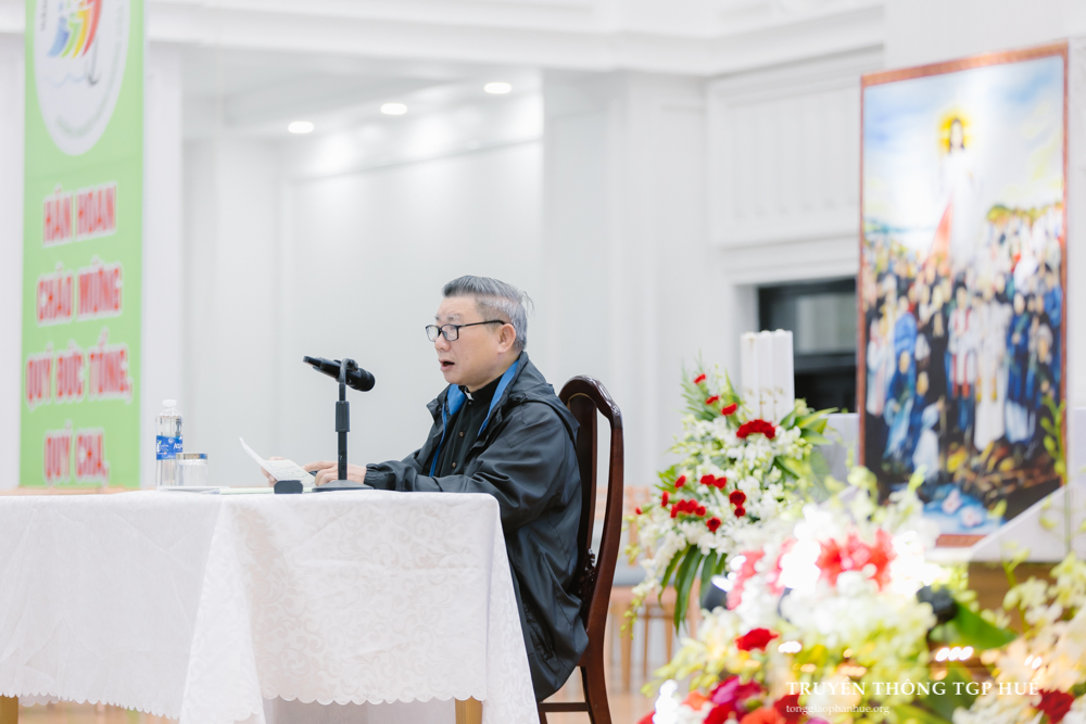 Kế đến, Đức Nguyên TGM Giuse Nguyễn Chí Linh cũng vài lời chúc mừng quý chức HĐMV. Ngài vui mừng nhìn thấy sức sống của TGP Huế trong hiện tại và hướng đến tương lai. Và ngài cảm thông với cả Giáo phận về những mất mát thiệt hại bởi các đợt bão lũ vừa qua.